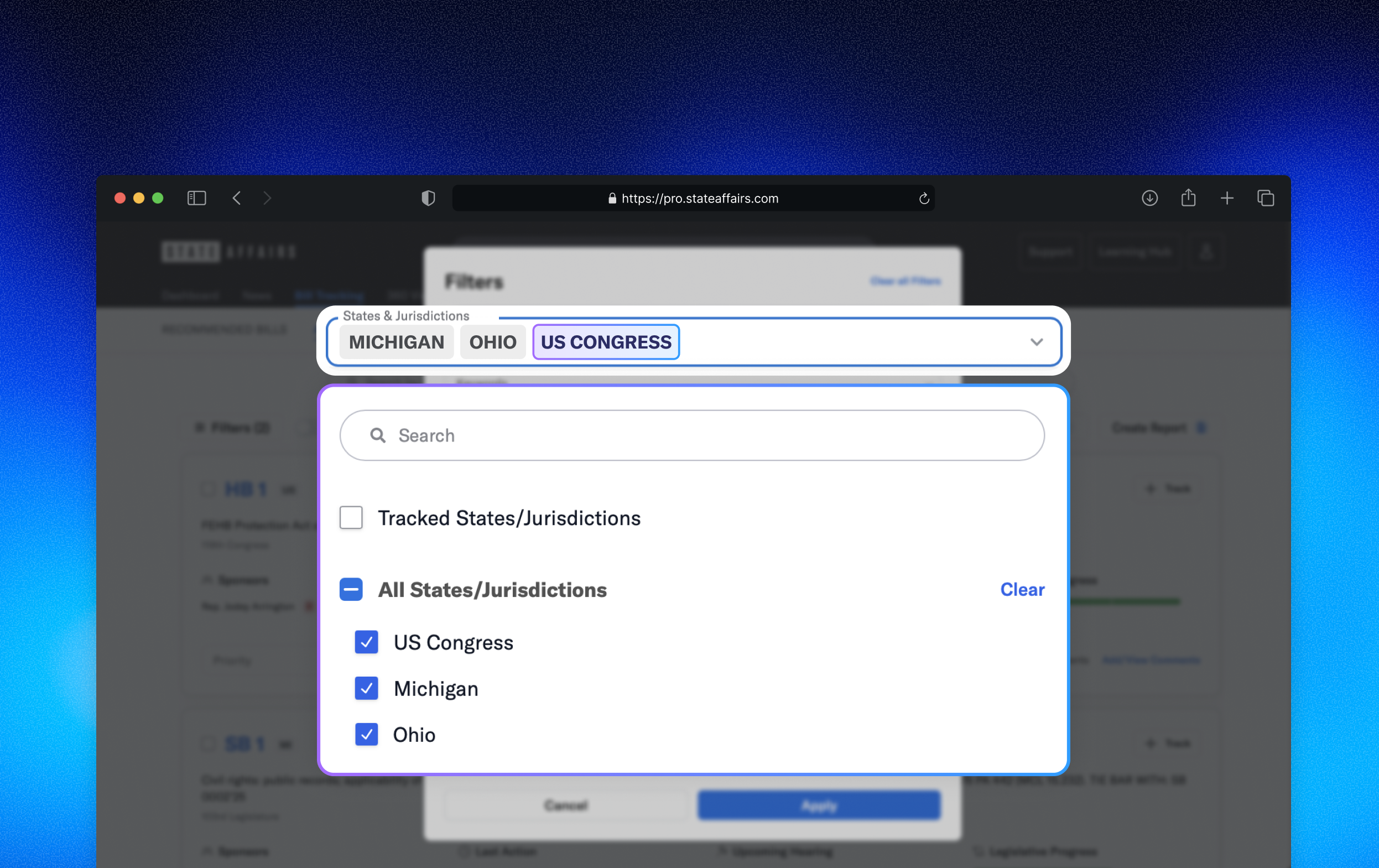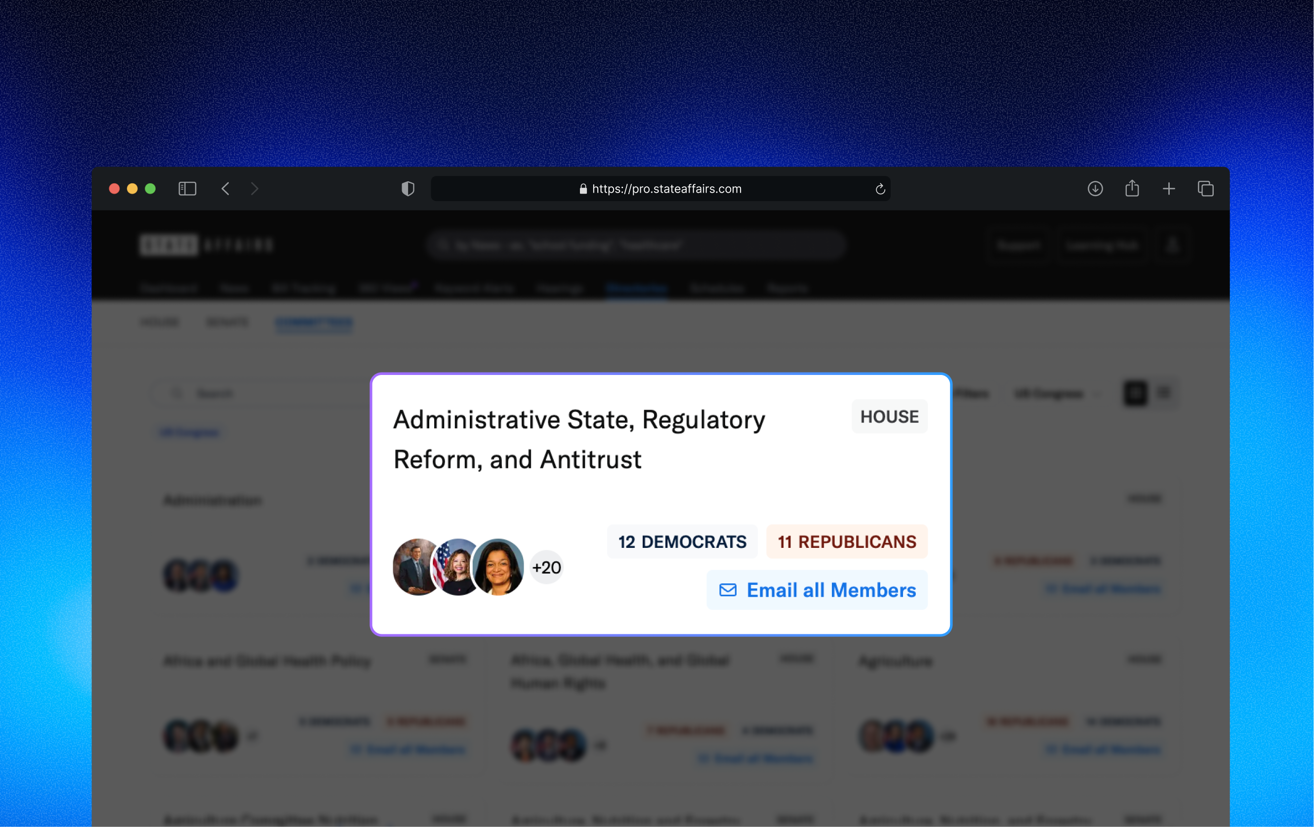 Federal hearings, bills, schedules, and directories—now in one unified workflow with your State coverage.